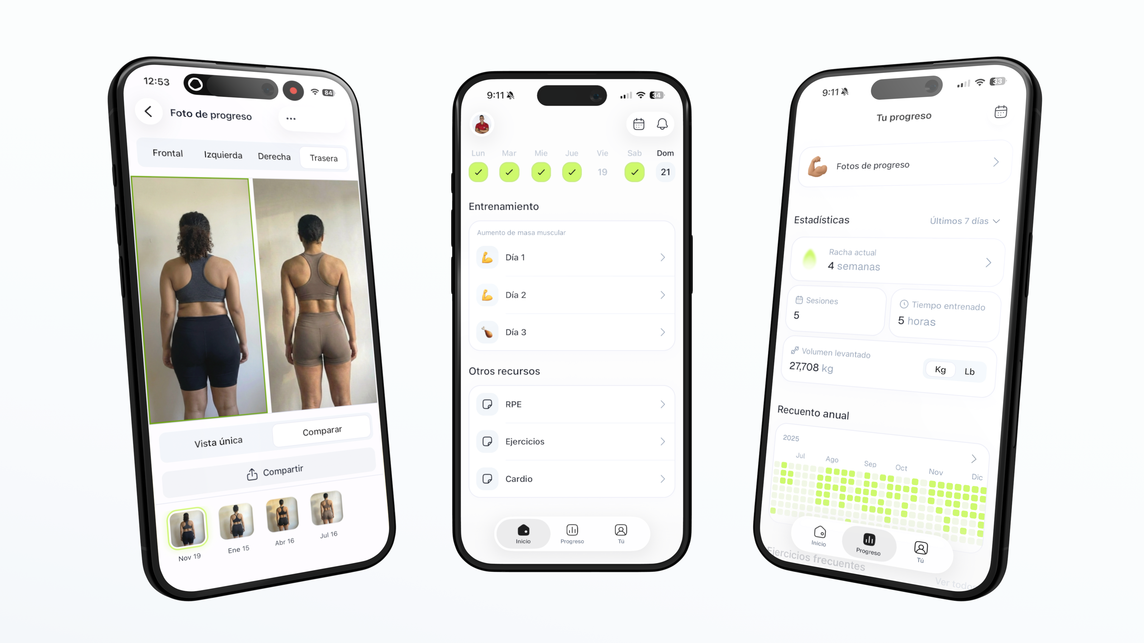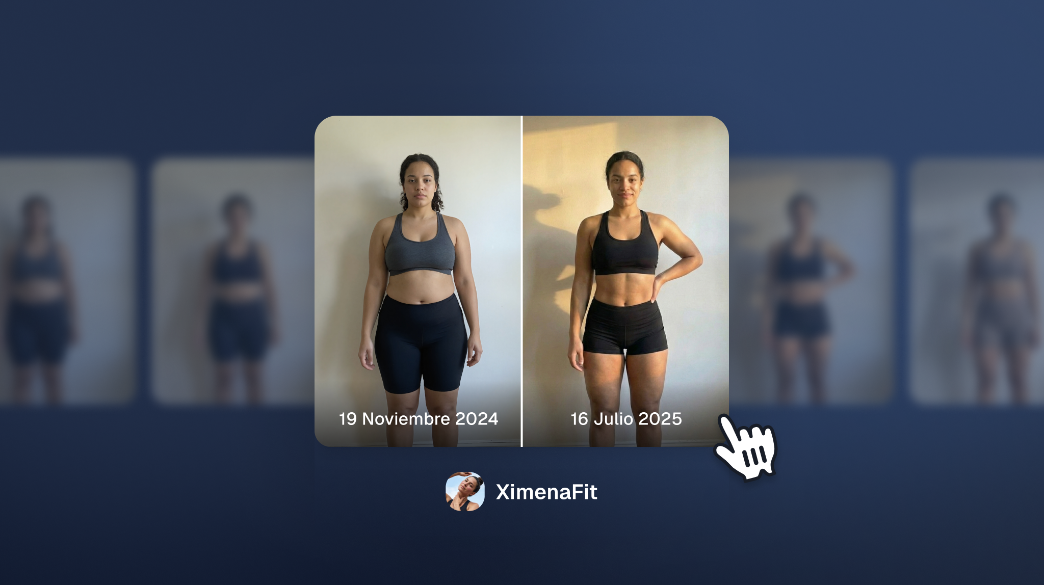 Sube tus fotos de distintos ángulos, compara fechas fácilmente, y compártelas. Estas fotos se comparten con tu entrenador para ajustar tu plan y celebrar tu progreso 💪 ¡Vas con todo!
