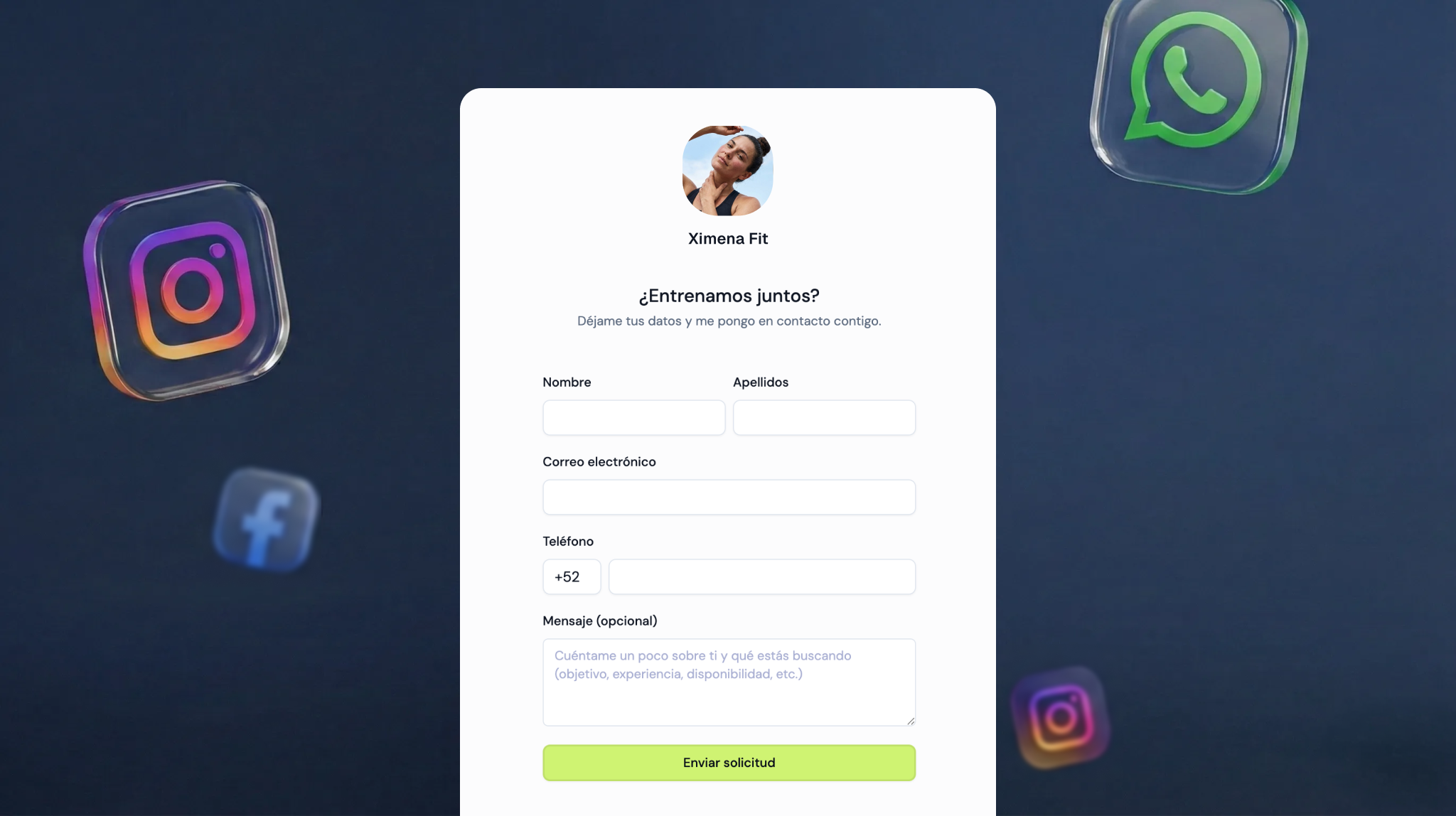 Comparte tu enlace en redes sociales, anuncios pagados o donde quieras, y las personas interesadas en tus servicios podrán dejarte sus datos de contacto. Tú recibes toda la información organizada en tu portal para darle seguimiento, calificarlos y convertirlos en clientes con un solo clic.