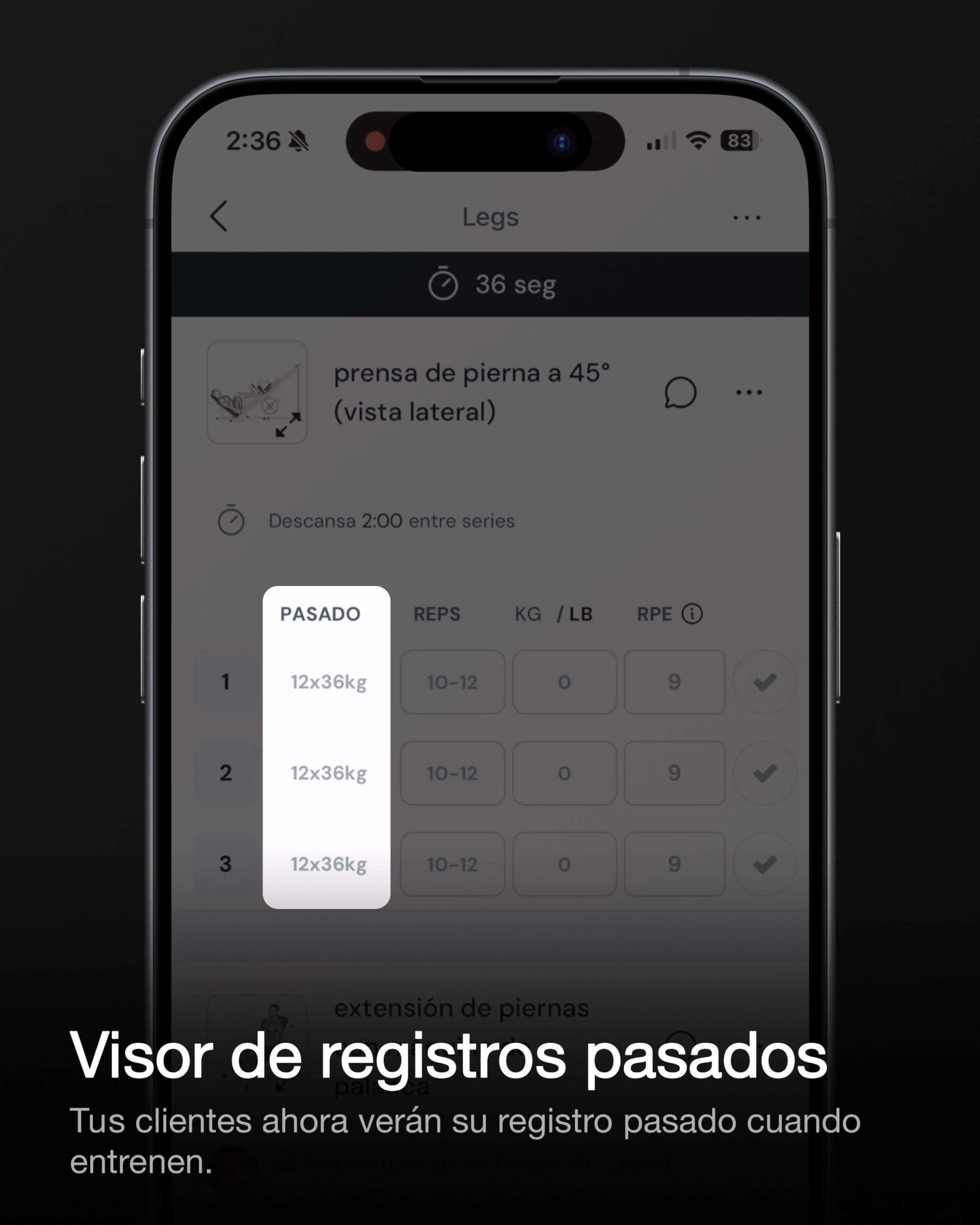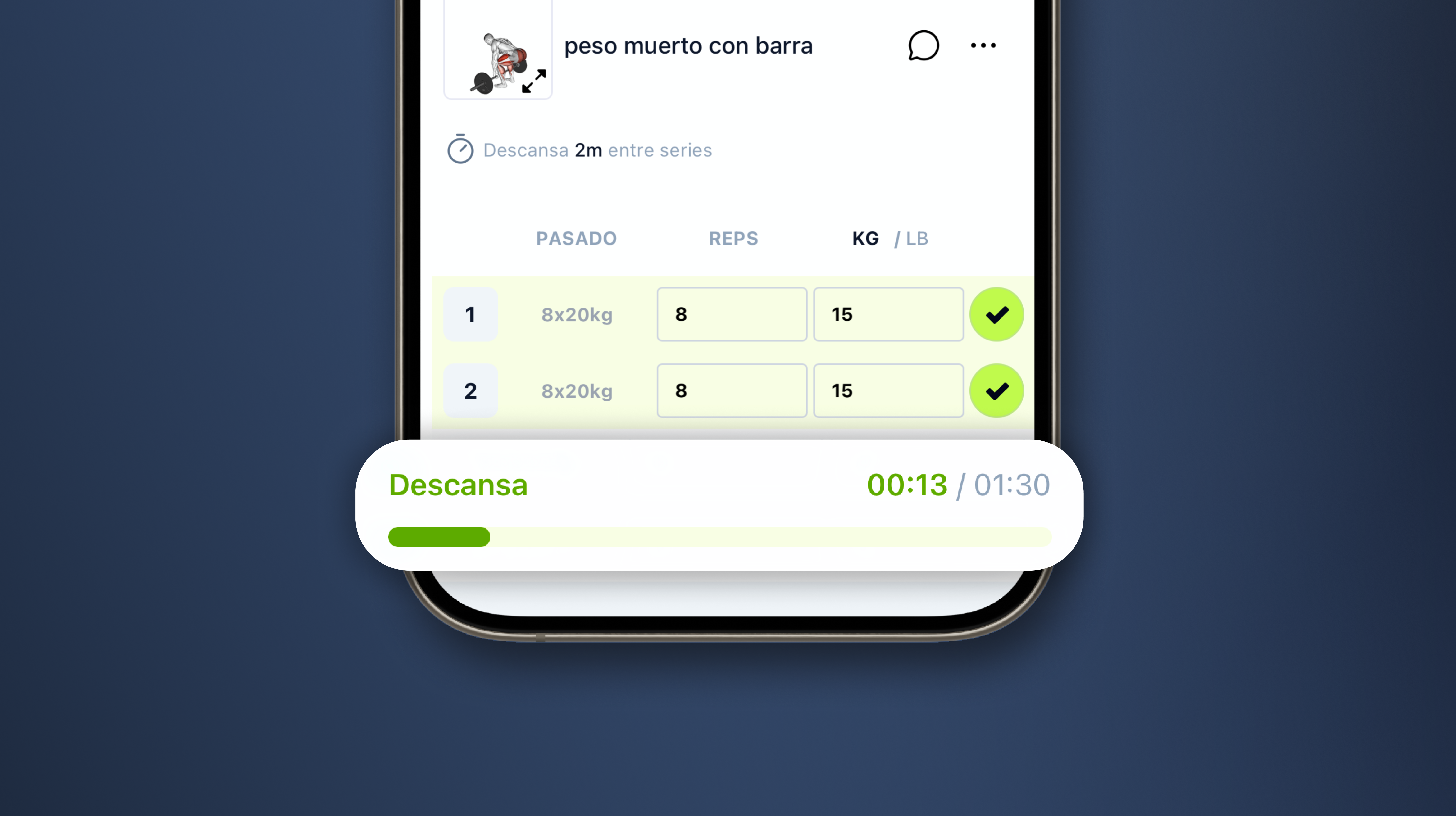 Ahora, al terminar cada serie, tus clientes verán automáticamente un temporizador de descanso según el tiempo que definiste en su rutina.