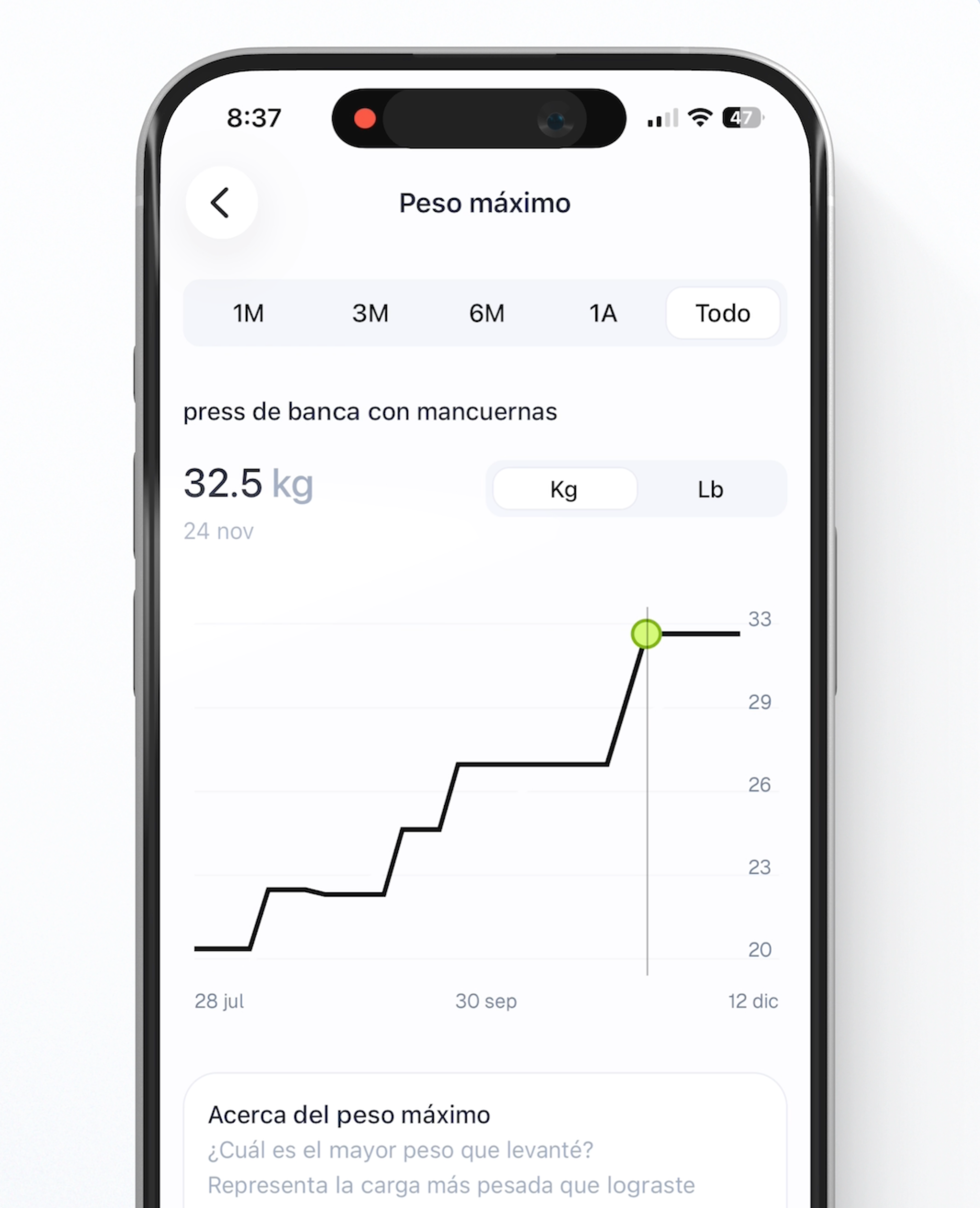 Ahora puedes ver tus estadísticas de ejercicio: historial, PRs, 1RM y mejores referencias para trabajar tu sobrecarga progresiva. Muy pronto también incluiremos estas gráficas mientras estés en una sesión de entrenamiento en curso.
