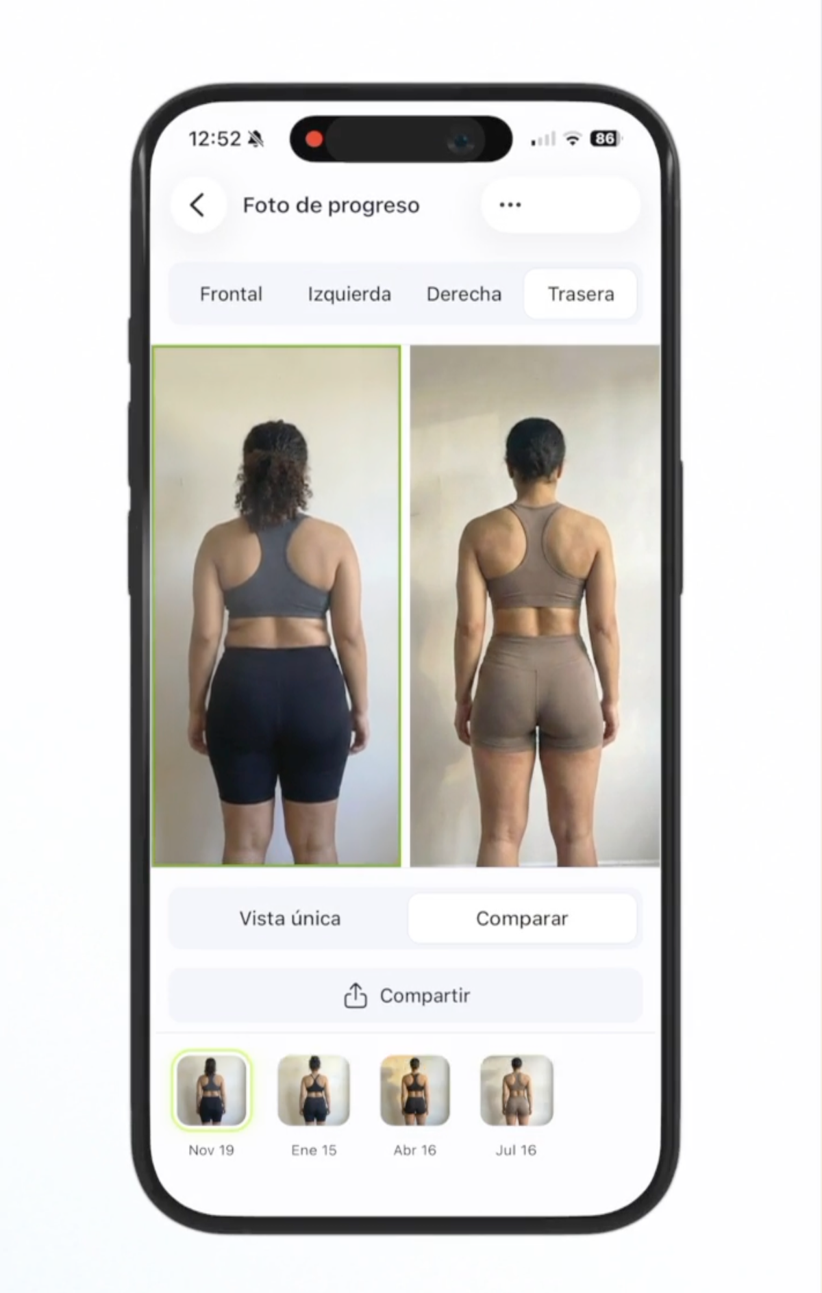 Sube tus fotos de distintos ángulos, compara fechas fácilmente, y compártelas. Estas fotos se comparten con tu entrenador para ajustar tu plan y celebrar tu progreso 💪 ¡Vas con todo!